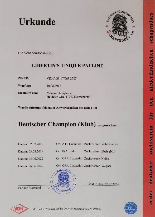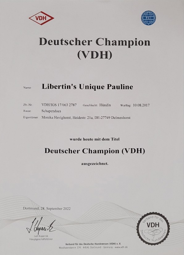 Heute möchten wir nachreichen, dass Pauline nach dem erfolgreichen Besuch der letzten Ausstellung die Punkte für den VDH Champion und Club Champion zusammen hatte und mit den Titeln Deutscher Champion (VDH) und Deutscher Champion (Klub) ausgezeichnet wurde. Wir sind ganz stolz auf unsere kleine, hübsche Maus.